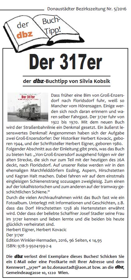 Gewinnspiel: Die dbz verlost drei Exemplare dieses Buches! Schicken Sie ein E-Mail oder eine Postkarte mit Ihrer Adresse und dem Kennwort „317er“ an bz.donaustadt@aon.at bzw. an die dbz, Gemeindeaugasse 10, 1220 Wien.