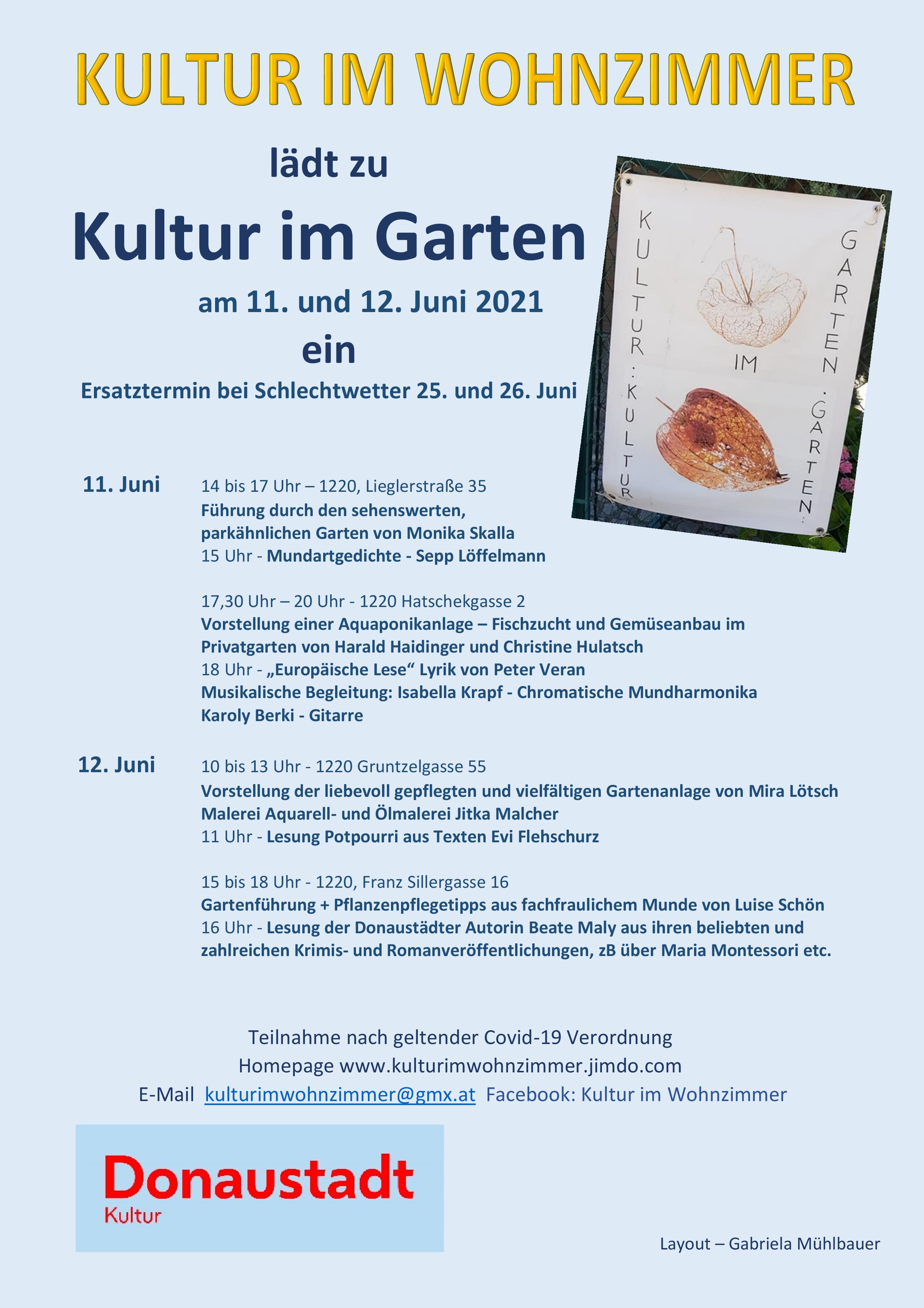 Der Esslinger Verein „Kultur im Wohnzimmer“ ist wieder aktiv und lädt am 11. und 12.6.2021 zu „Kultur im Garten“ mit Gartenführungen und einer Lesung der Donaustädter Schriftstellerin Beate Maly.