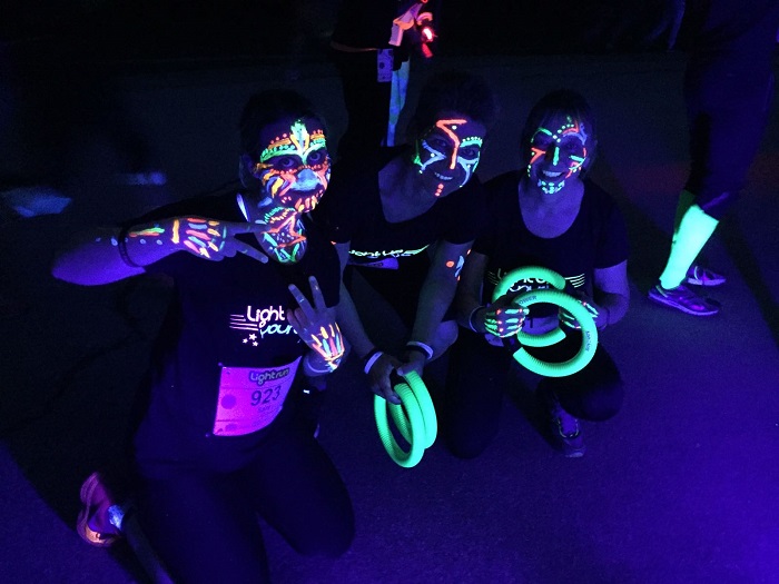 Vor dem Night-Walk stylen sich die TeilnehmerInnen im idyllischen xundZeit-Garten in Wien Essling und zaubern sich mit Neon-Farben ein Face-Painting ins Gesicht. Danach startet der Walk mit den grünen smovey Ringen in Richtung Äcker und Wald. Zum Abschluss wird das fluoreszierende Body-Painting mit UV-Lampen zum Leuchten gebracht. Es gibt hausgemachten Sirup und Kräuterwasser.
