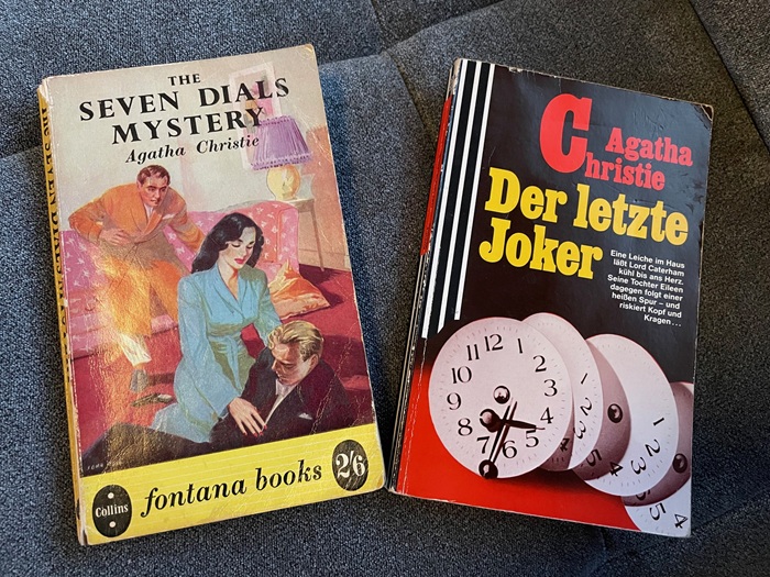 In meinen Zwanzigern habe ich so ziemlich alle Krimis der „Queen of Crime“ Agatha Christie gelesen. Später ihre Autobiografie mehrfach, weil sie mich so beeindruckt hat. Für mich ist es danach ruhig geworden rund um Agatha Christie. Aber jetzt begegne ich ihr gerade wieder verstärkt. Zum Einen habe ich mir vor kurzem die Mini-Netflix-Serie „Agatha Christie’s Seven Dials“ angeschaut, was mich gleich zur Relektüre des Buches verführt hat. In meinem Buchregal finden sich sowohl eine deutsche als auch eine englische Ausgabe. Es hat mir großen Spaß gemacht, den Krimi in der heute antiquiert anmutenden Sprache im Original zu lesen.