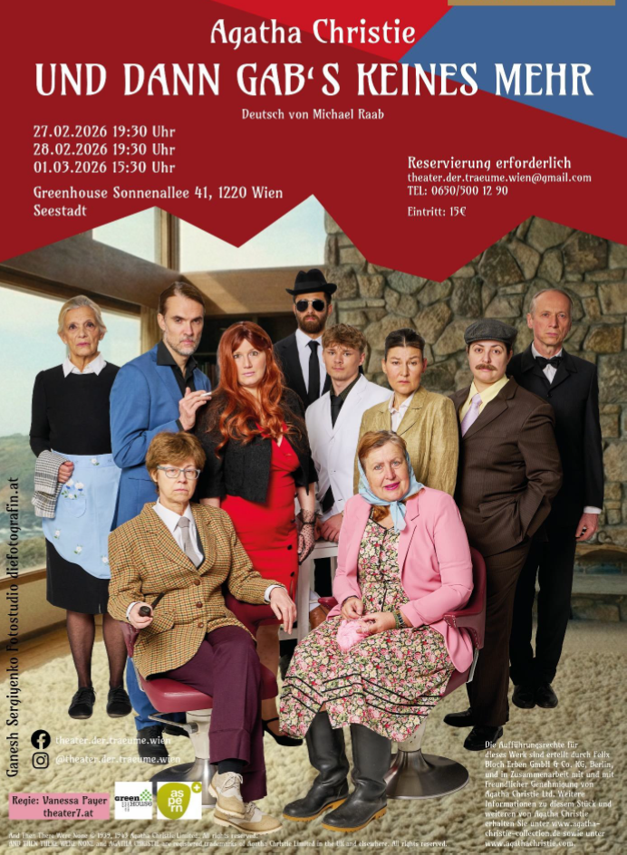 Die Amateur-Theatergruppe Theater der Träume bringt „Und dann gab’s keines mehr“ von Agatha Christie im Greenhouse in der Seestadt Aspern auf die Bühne. Als großer Christie-Fan freue ich mich sehr, dass es damit die Chance gibt, sie neu- bzw. wiederzuentdecken.